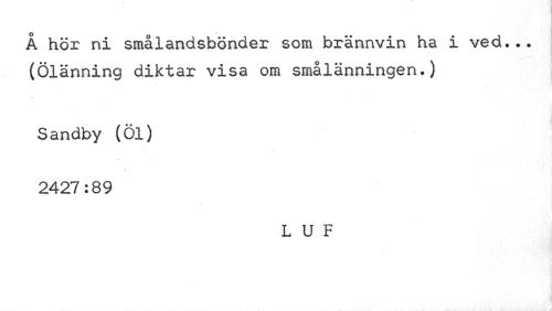 //// o 0 //// A hör ni smalandsbönder som brännvin ha i ved... (Ölänning diktar visa om smålänningen.) //// Sandby (Öl) 2427:89 //// LUF ////