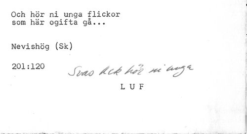 //// Och hör ni unga flickor j //// som här ogifta gå... //// ¦ //// i //// Nevishög (Sk) //// I i //// 201:120 s»u> m ~ //// L U F ////
