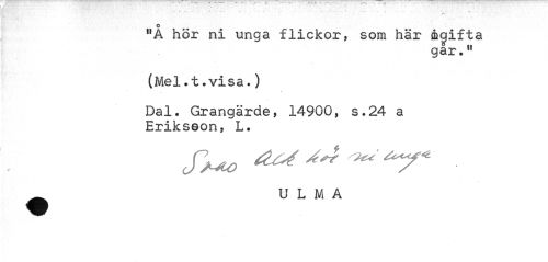 //// /*v //// "Å hör ni unga flickor, som här åqifta //// gar.11 //// (Mel. t .visa.) //// Dal. Grangärde, 14900, s.24 a Erikseon, L. //// U L M A ////