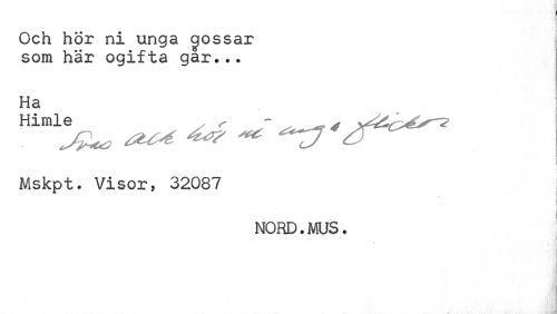 //// Och hör ni unga gossar som här ogifta gar... //// i //// Mskpt. Visor, 32087 //// NORD.MUS. //// J ////