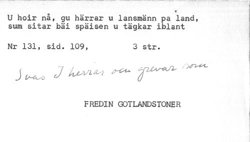 //// U hoir nå, gm härrar u lansmänn pa land, surn sitar bäi späisen u tägkar iblant //// Nr 131, sid. 109, 3 str. //// i //// FREDIN GOTLANDSTONER //// - ////