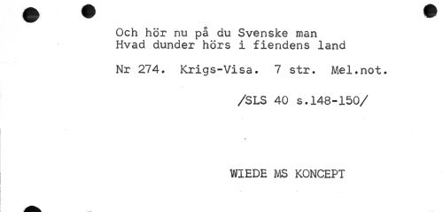 //// ¦A) U //// Och hör nu på du Svenske man Hvad dunder hörs i fiendens land //// Nr 274. Krigs-Visa. 7 str. Mel.not. //// /SLS 40 s.148-150/ //// i //// WIEDE MS KONCEPT ////