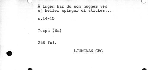 //// Å ingen har du som hugger ved ej heller spingar di sticker... //// s.14-15 Torpa (Sm) 238 fol. //// ^ LJUNGMAN GBG ////