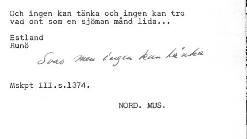 //// Och ingen kan tänka ochoingen kan tro ? //// vad ont som en sjöman månd lida... //// Estland j //// Runö r l //// ¦ //// i //// Mskpt III.s.1374. | //// [ //// p //// NORD. MOS. ////