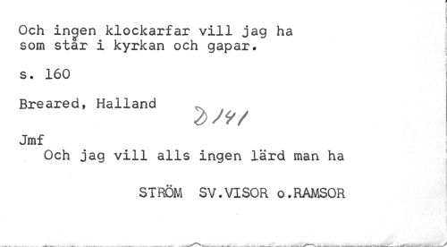 //// Och ingen klockarfar vill jag ha som star i kyrkan och gapar. //// s. 160 //// Breared, Halland //// 7>S9/ //// Jmf //// Och jag vill alls ingen lärd man ha //// STRÖM SV.VISOR o.RAMSOR ////