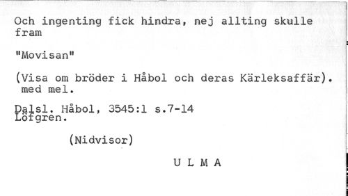//// Och ingenting fick hindra, nej allting skulle fram //// ¦ ¦ //// "Movisan" //// (Visa om bröder i Håbol och deras Kärleksaffär), med mel. //// Dalsl. Håbol, 3545:1 s.7-14 Löfgren. //// (Nidvisor) //// U L M A //// i i ////