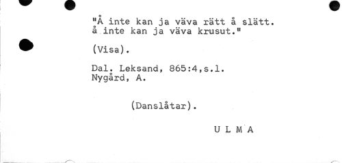 //// O 0 //// "A inte kan ja väva rätt a slätt, å inte kan ja väva krusut.11 //// ^^ (Visa). //// Dal. Leksand, 865:4,s.l. Nygård, A. //// (Danslåtar). //// U L MA ////