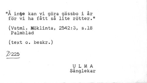 //// "Å inije kan vi göra gässbo i år för vi ha fått så lite rötter.11 //// (Vstrnl. Möklinta, 2542:3, s.18 Palmblad //// (text o. beskr.) $225 //// u l m a //// Sånglekar ////