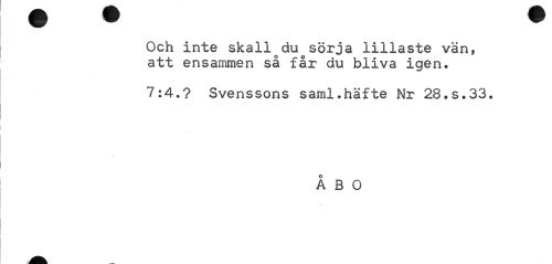 //// Och inte skall du sörja lillaste vän, att ensammen så får du bliva igen. //// 7:4.? Svenssons saml.häfte Nr 28.S.33. //// ÅBO ////
