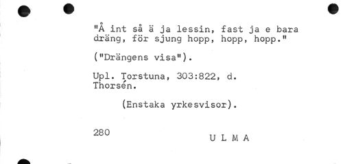 //// o //// ,!A int sa ä ja lessin, fast ja e bara dräng, för sjung hopp, hopp, hopp." //// ("Drängens visa"). //// Upl. Torstuna, 303:822, d. Thorsen. //// (Enstaka yrkesvisor). 280 U L M A ////