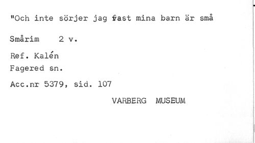 //// "Och inte sörjer jag fast mina barn är små //// Smårim 2 v. //// Ref. Kålen Fagered sn. //// ¦ //// Acc.nr 5379, sid. 107 //// l //// VARBERG MUSEUM ////