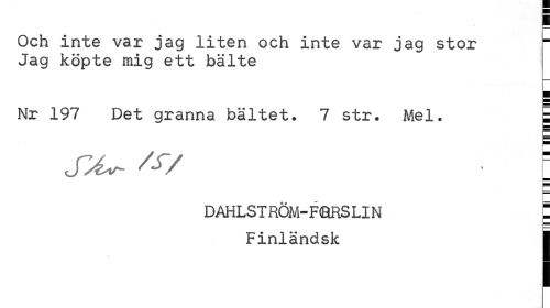 //// Och inte var jag liten och inte var jag stor Jag köpte mig ett bälte //// b //// Nr 197 Det granna bältet. 7 str. Mel. | //// i_ //// SA^ Ay ; //// DAHLSTRÖM-FORSLIN C //// Finländsk I ////