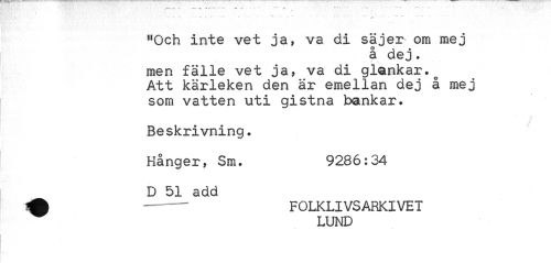 //// : //// . . -...v ... - ... . . —" - //// "Och inte vet ja, va di säjer om mej //// å dej. //// men fälle vet ja, va di glankar.o Att kärleken den är emellan dej å mej som vatten uti gistna bankar. //// Beskrivning. //// Hånger, Sm. 9286:34 //// D 51 add //// A --— FOLKLIVSARKIVET //// LUND ////