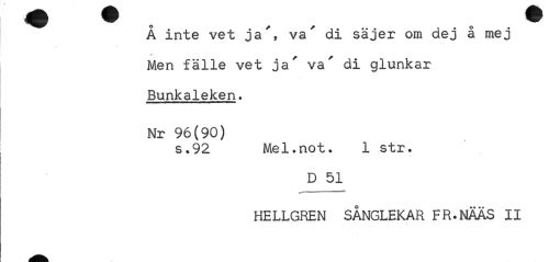 //// Å inte vet ja', va' di säjer om dej å mej Men fälle vet ja' va' di glunkar Bunkaleken. //// Nr 96(90) //// s.92 Mel.not. 1 str. //// D 51 //// ^mmmmmmrnammmmmm^mt //// HELLGREN SÅNGLEKAR FR.NÄÄS II //// I ////