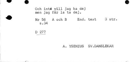 //// Och inté vill jag ha dej men jag får la ta dej, //// ^^ Nr 58 A och B End. text 3 str. //// s * 34 //// D 277 //// A. YSENIUS SV.DANSLEKAR ////