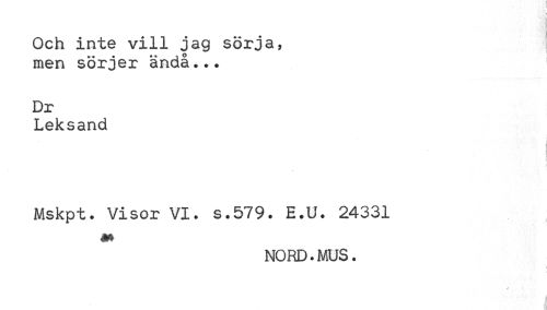 //// Och inte vill jag sörja, men sörjer ändå,.. //// Dr //// Leksand //// Mskpt. Visor VI. s.579. E.U. 24331 //// M //// NORD.MUS. //// i //// •< i //// j ////