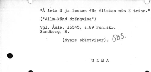 //// * //// o //// "A inte ä ja lessen för flickan min ä trinn." //// ("Allm.känd drängvisa") //// Vgl. Åsle, 16545, s.89 Fon.skr. //// (Nyare skämtvisor), ö //// m //// U L M A ////