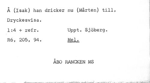 //// Å (Isak) han dricker nu (Mårten) till, //// « //// Dryckesvisa. //// 1:4 + refr. Uppt. Sjöberg. //// R6, 205, 94. Mel. //// ÅBO RANCKEN MS ////