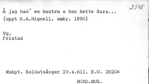//// JtdHf //// A jag had en hustru o hon hette Sara... //// (uppt K.A.Rignell, omkr. 1890) //// •i //// Vg. //// Fristad //// ¦ Mskpt. Soldatsånger IV.s.611. E.U. 28204 j //// NORD.MÖS. ////
