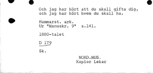//// Och jag har hört att du skall gifta dig, och jag har hört hvem du skall ha, //// ^^ Hammarst. ark. //// Ur "Manuskr. 9" s.141. //// 1880-talet //// D 179 //// Sk. //// NORD. MUS. Kopior Lekar //// X -v. ////