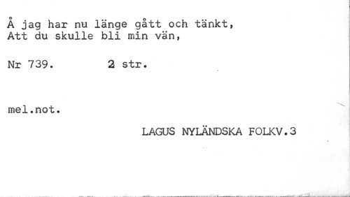 //// Å jag har nu länge gått och tänkt, Att du skulle bli min vän, //// Nr 739. 2 str. //// i //// mel.not. //// LAGUS NYLÄNDSKA FOLKV.3 //// * ////