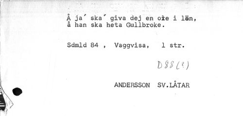 //// ... . w"-- -• .. - - ... - v ¦ .- - . ... ... •» //// r\ //// ¦ ¦' T • . . ' //// A ja' ska' giva dej en oie i län, å han ska heta Gullbroke• //// Sdmld 84 , Vaggvisa, 1 str. //// ^ ^ andersson sv.låtar //// f> //// m/ ////