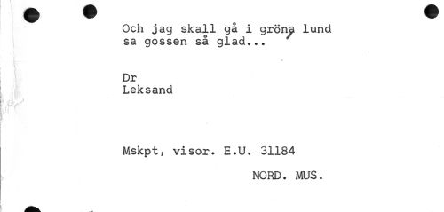 //// Och jag skall gå i gröna lund sa gossen så glad... //// Dr //// Leksand //// fff //// Mskpt, visor. E.U. 31184 //// NORD. MUS. ////