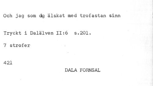 //// Och jag som dig älskat med trofastan sinn J //// ? //// Tryckt i Dalälven 11:6 s.201. 7 strofer //// 421 //// DALA FORNSAL ////