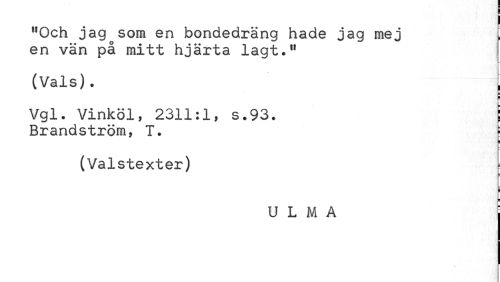 //// "Och jag som en bondedräng hade jag mej en vän på mitt hjärta lagt*" //// (Vals). //// E i? //// Vgl. Vinköl, 2311:1, s.93. //// Brandströra, T. f //// i //// (Valstexter) //// i ¦ //// U L M A ////