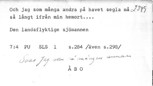 //// Och jag som manga andra pa havet segla ma så långt ifrån min hemort... //// i //// Den landsflyktige sjömannen //// 7:4 PU SLS 1 s.284 /även s.298/ //// ÅBO i ////