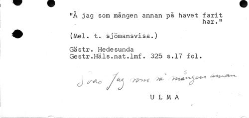 //// "Å jag som mången annan på havet farit //// har." //// ^^ (Mel. t. sjömansvisa.) //// Gästr. Hedesunda //// Gestr.Häls.nat.lmf. 325 s.17 fol. //// j ^ A * ^T" //// U L M A //// 0 //// « //// ---v ' ////
