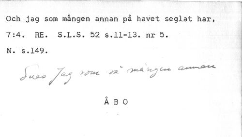 //// 1 //// V1"' '' V''' //// Och jag som mången annan på havet seglat har, //// . . . ¦ i //// 7:4. RE. S.L.S. 52 s.11-13. nr 5. N. s.149. //// ÅBO //// I ////