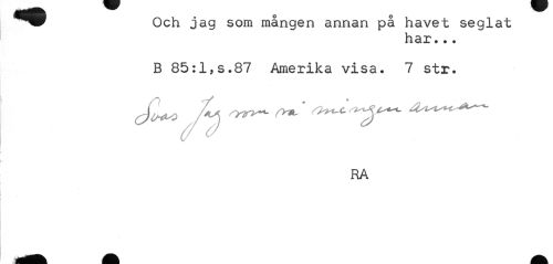 //// ^^P Och jag som mången annan på havet seglat //// har.•. //// B 85:1,s.87 Amerika visa. 7 str. //// RA ////