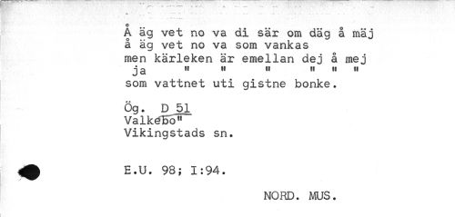 //// o • - //// A äg vet no va di sär om däg a mäj å äg vet no va som vankas //// men kärleken är emellan dej å mej //// j q it »t ii it u u //// som vattnet uti gistne bonke. //// Ög. D 51 ValkéBo" Vikingstads sn. //// A E.U. 98; 1:94. //// NORD. MUS. ////