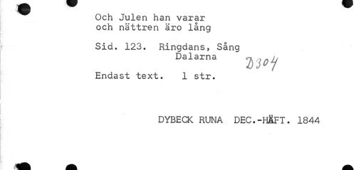 //// Och Julen han varar och nättren äro lång //// Sid. 123. Ringdans, Sång //// Dalarna 7 //// Endast text. 1 str. //// DYBECK RUNA DEC.-HäFT. 1844 ////