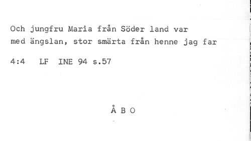 //// ! ¦ //// Och jungfru Maria från Söder land var //// i //// med ängslan, stor smärta från henne jag far | //// ii //// 4:4 LF INE 94 s.57 ; //// i //// le //// o //// A B 0 //// I ////