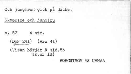 //// Och jungfrun gick på däcket //// i //// Skeppare och jungfru //// s. 53 4 str. //// (DgF 241) (Arw 41) //// (Visan börjar å sid.56 //// Tr.nr 18) //// BORGSTRÖM MS KVHAA j ////