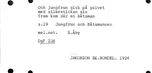 //// Och jungfrun gick på golvet med silkestickan sin fram kom där en båtsman //// s.19 Jungfrun och Båtsmannen //// mel•not? S.Åby //// DgF 238 //// * ' j f //// JAKOBSON SK.BONDEL. 1924 ////
