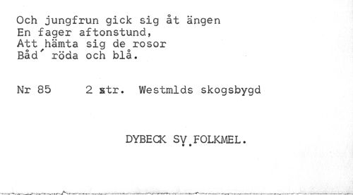 //// Och jungfrun gick sig åt ängen En fager aftonstund, Att^hämta sig de rosor Båd' röda och blå. //// Nr 85 2 str. Westmlds skogsbygd //// DYBECK Sy #FOLKMEL. ////
