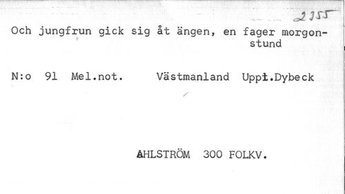 //// Och jungfrun gick sig åt ängen, en fager morgonstund //// N:o 91 Mel.not. Västmanland Uppt.Dybeck //// ÅHLSTRÖM 300 FOLKV. ////