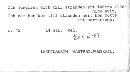 //// Och jungfrun gick till stranden att tvätta kläd- //// ning hvit, //// Och när hon kom till stranden ner, hon mötte //// ett herreskepp. //// s. 42 14 str. Mel. //// LANDTMANSON VÄSTE RG. MUSIKBIL. //// ut ////