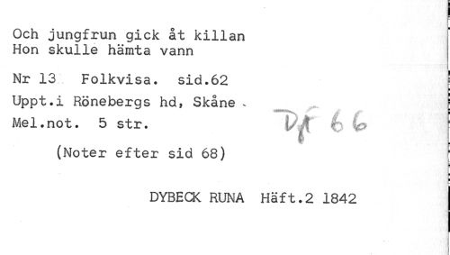 //// Och jungfrun gick åt killan Hon skulle hämta vann //// Nr 13 Folkvisa, sid.62 ! //// i //// Uppt.i Rönebergs hd, Skåne ^ _ 1 //// ? g J i //// Mel.not. 5 str. |/J( f> (p //// (Noter efter sid 68) //// i ¦ //// I //// DYBECK RUNA Haft.2 1842 I ////