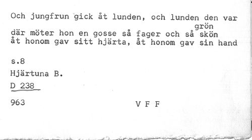 //// Och jungfrun gick åt lunden, och lunden den var //// grön //// där möter hon en gosse så fager och så skön åt honom gav sitt hjärta, åt honom gav sin hand //// s .8 //// i { //// i //// Hjärtuna B. //// D 238 //// ___ //// 963 V F F ////