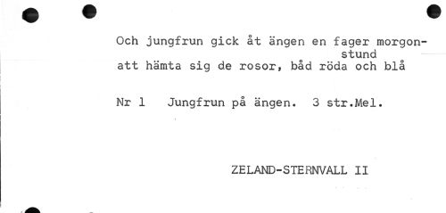 //// Och jungfrun gick åt ängen en fager morgonstund -- //// att hämta sig de rosor, båd röda och blå //// Nr 1 Jungfrun på ängen. 3 str.Mel. //// » //// ZELAND-STERNVALL II ////