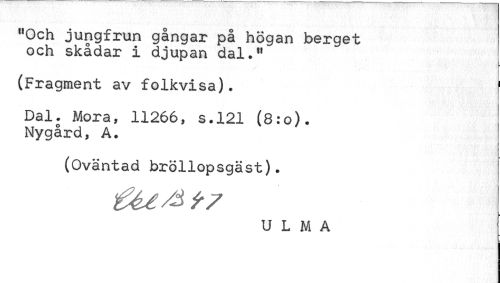 //// "Och jungfrun gångar på högan berget och skådar i djupan dal." //// (Fragment av folkvisa). f //// Dal. Mora, 11266, 8.121 (8:0). //// Nygård, A. //// (Oväntad bröllopsgäst). //// U L M A ////