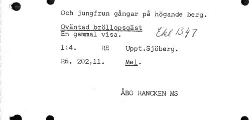 //// Och jungfrun gångar på högande berg. //// Oväntad bröllopsgäst y > ^ / -7 En gammal visa. ¦ 7 / //// 1:4. RE Uppt.Sjöberg. //// R6, 202,11. Mel. //// ÅBO RANCKEN MS ////