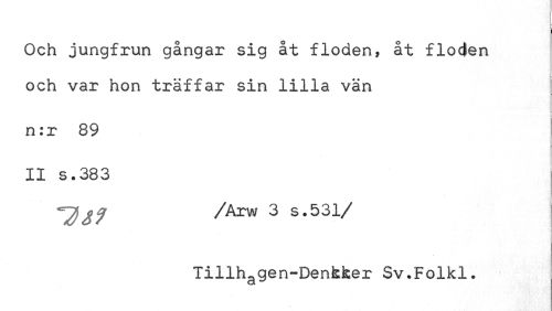 //// ¦ //// Och jungfrun gångar sig åt floden, åt floden och var hon träffar sin lilla vän //// n:r 89 //// II s.383 //// /Arw 3 s.531/ Tillhagen-Denkfcer Sv.Folkl. ////