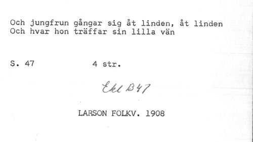 //// Och jungfrun gångar sig åt linden, åt linden Och hvar hon träffar sin lilla vän //// S. 47 4 str. //// » //// l //// LARSON FOLKV. 1908 ////