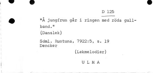 //// D 125 //// "A jungfrun går i ringen med röda gull- //// band." //// (Danslek) //// Sdml. Runtuna, 7922:5, s. 19 i Dencker //// f (Lekmelodier) //// | //// U L M A //// —-••- / ////