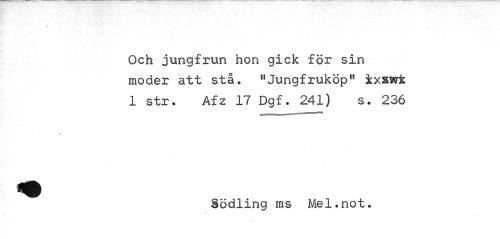 //// t //// Och jungfrun hon gick för sin moder att stå. "Jungfruköp11 ix&wi 1 str. Afz 17 Dgf. 241) s. 236 //// * //// Södling ms Mel.not. ////